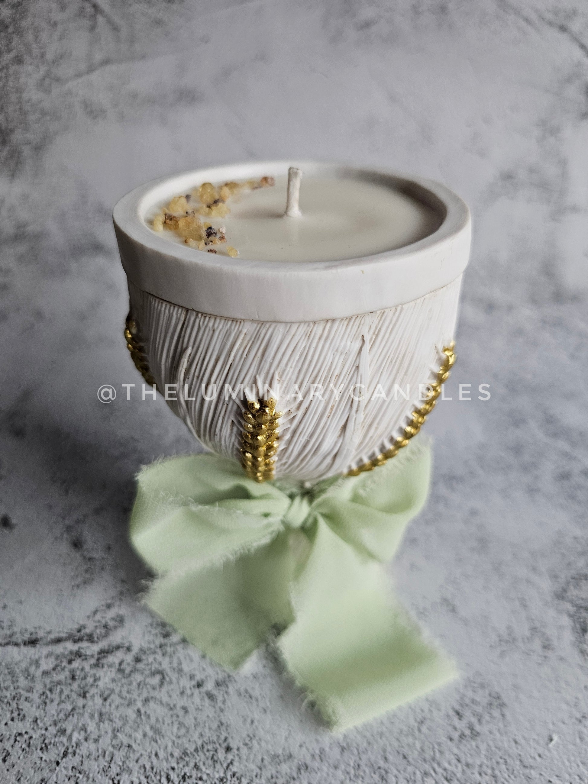 Celebrate your sacred moments with our Holy Communion Chalice Candle, exclusively from The Luminary Candles. This elegant gold-tone chalice features intricate wheat detailing, symbolising the Eucharist's spiritual nourishment. Hand-poured with natural soy wax, it offers a clean, long-lasting burn. Perfect for First Communions, baptisms, or as a cherished keepsake, this candle embodies faith and tradition. Personalisation options are available to make your gift truly unique.