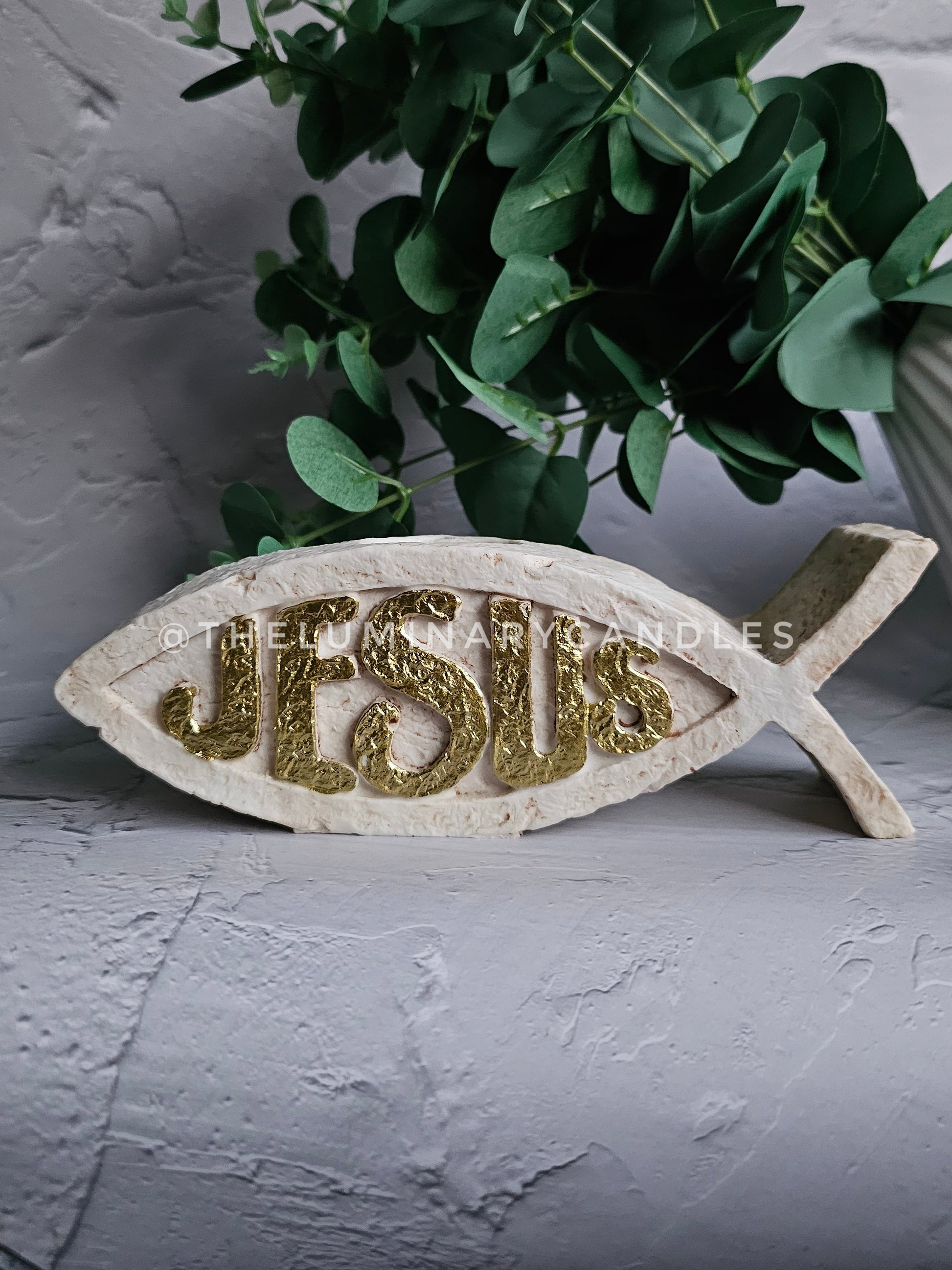 This elegant tea light holder is crafted in the shape of the Christian Ichthys fish, a timeless symbol of faith. Made from durable material with a smooth finish, it features the word "Jesus" beautifully inscribed in shimmering gold across the center. Perfect for adding a warm, spiritual glow to any space.